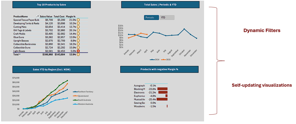 Notes: Certain filters have been restricted from affecting visualizations such as the Sales YTD vs. PY Sales YTD, making it easier to slice the rest of the data without missing out on key metrics that do not need to be filtered!