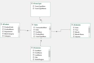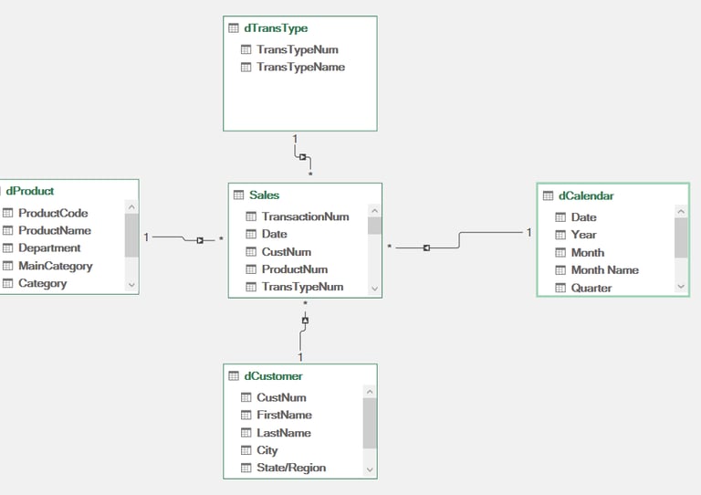 Applying the star-type relational model, we configure the relationships between our multiple dimension tables and our fact table (sales).